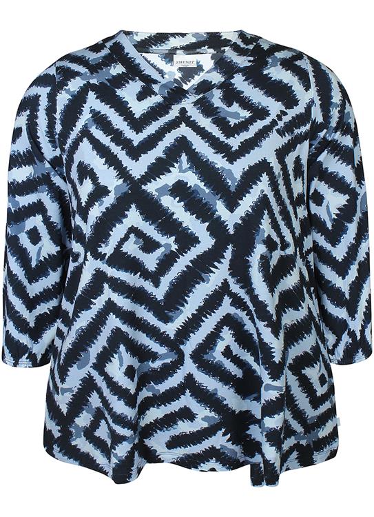 Omdat deze Lichtblauwe Zhenzi top een uitgesproken dessin heeft, combineer je hem goed met een effen broek of een neutrale rok. De pasvorm is ontworpen om comfort te bieden en soepel te vallen, wat deze blouse tot een betrouwbaar kledingstuk maakt. Bekijk alle Zhenzi kleding voor grotere maten die je makkelijk kunt combineren met deze blouse.Productkenmerken