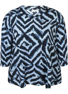 Deze Zhenzi Blouse 201171 Lichtblauw is een casual overhemd met een opvallend dessin, afkomstig uit de collectie van Zhenzi kleding voor grotere maten. Het kledingstuk is uitgevoerd in een spiraalvormig geometrisch patroon in de kleurstelling donkerblauw, grijsblauw en wit. Je draagt deze top makkelijk voor een comfortabele en toegankelijke alledaagse look.