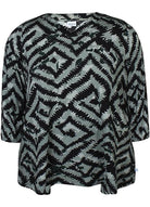 Deze Zhenzi Blouse 201171 in Lichtgroen is uitgevoerd met een grafisch all-over ruitdessin. De stof kenmerkt zich door een combinatie van tinten zwart, donkergroen en lichtgroen, waardoor een opvallend motief ontstaat. De blouse heeft een elegante V-halslijn. Deze casual top is een veelzijdig kledingstuk dat je makkelijk combineert voor een comfortabele en nuchtere look. Het ontwerp van deze Zhenzi tuniek past goed bij een optimistische levensstijl.