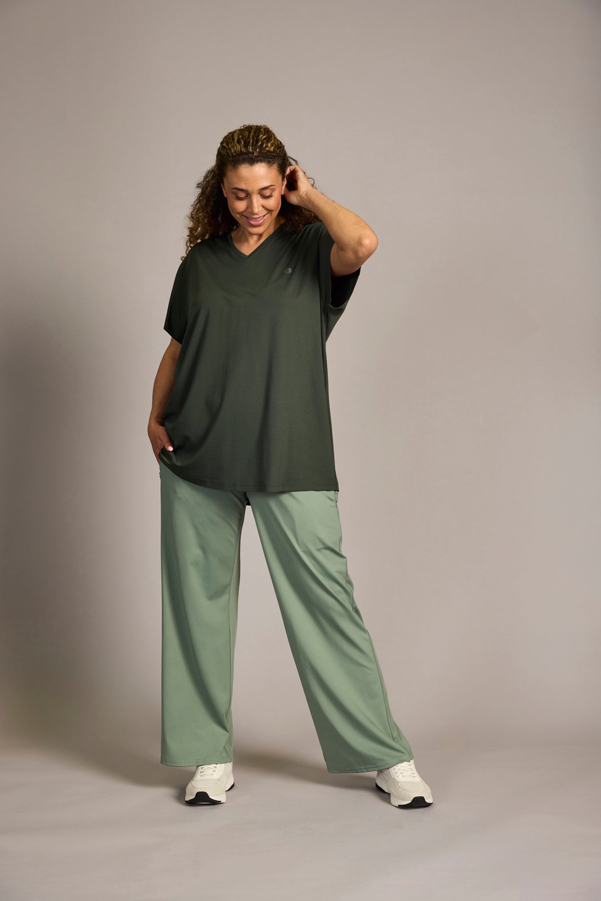 Deze Zhenzi Broek is een effen lichtgroene damesbroek. De pantalon heeft een wijde, rechte pasvorm die comfortabel draagt. De broek is afgewerkt met insteekzakken aan de zijkant voor een praktische touch. Dit model is een casual basisstuk voor je garderobe, ontworpen door het merk Zhenzi. Met deze wijde pijpen broek creëer je eenvoudig een moderne, relaxte look.