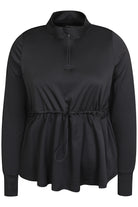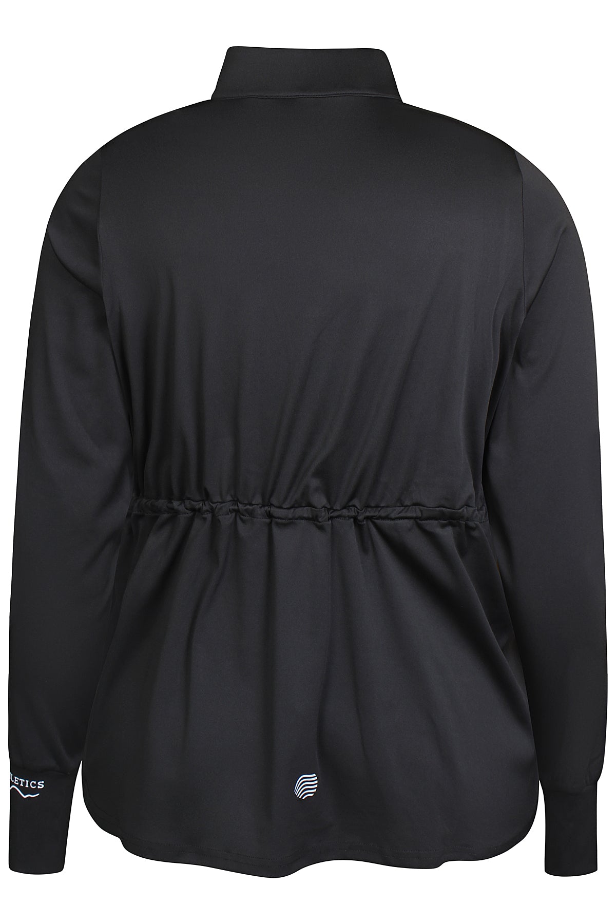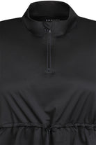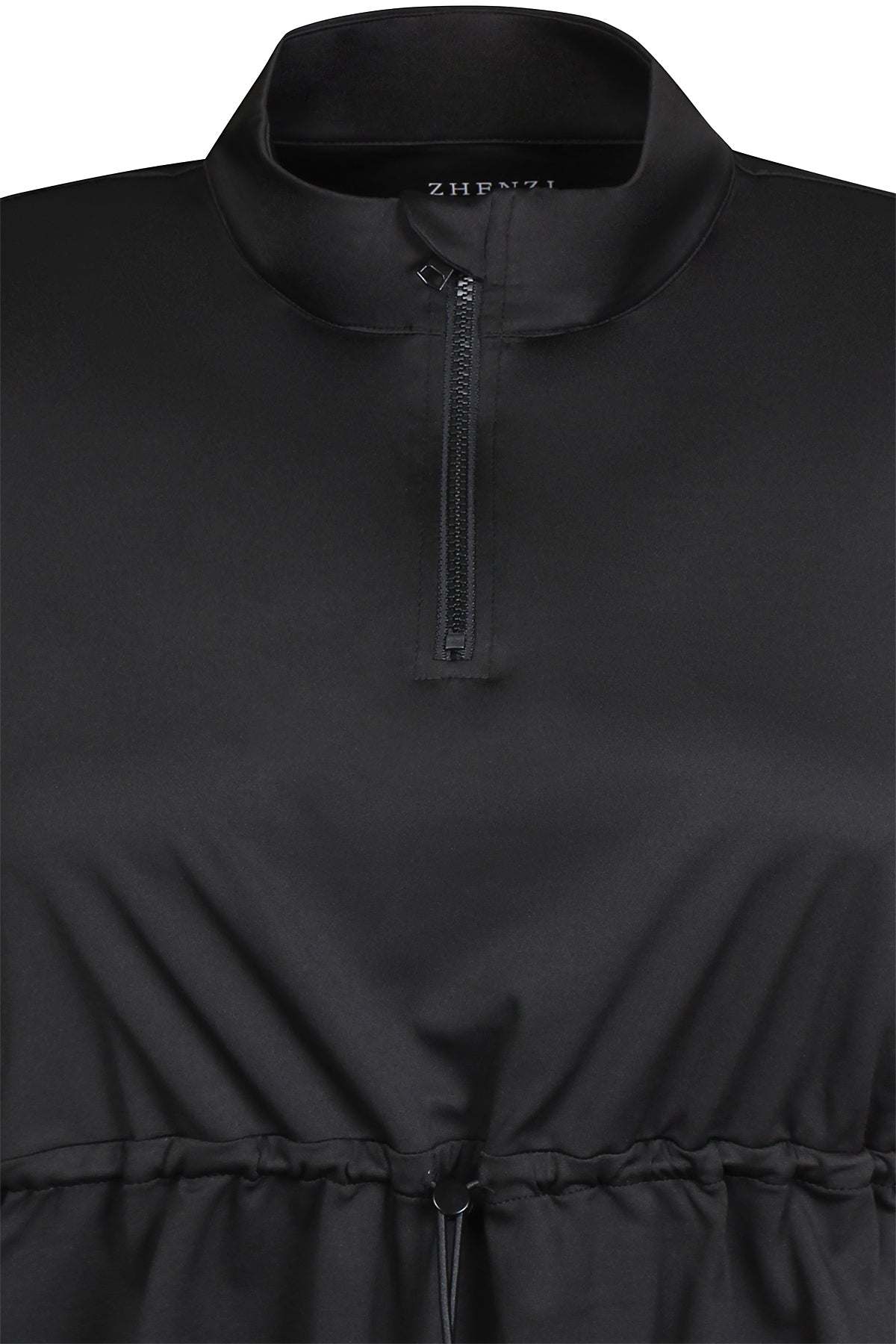 Deze zwarte pullover van Zhenzi is een sportieve trainingstop met een opstaande kraag. De top sluit hoog aan de hals door middel van een korte rits. Een functioneel detail is het aantrekkoord in de taille, waarmee je zelf de pasvorm aanpast. Deze sportieve trui met lange mouwen heeft boorden aan de manchetten en valt wijd over de heupen.